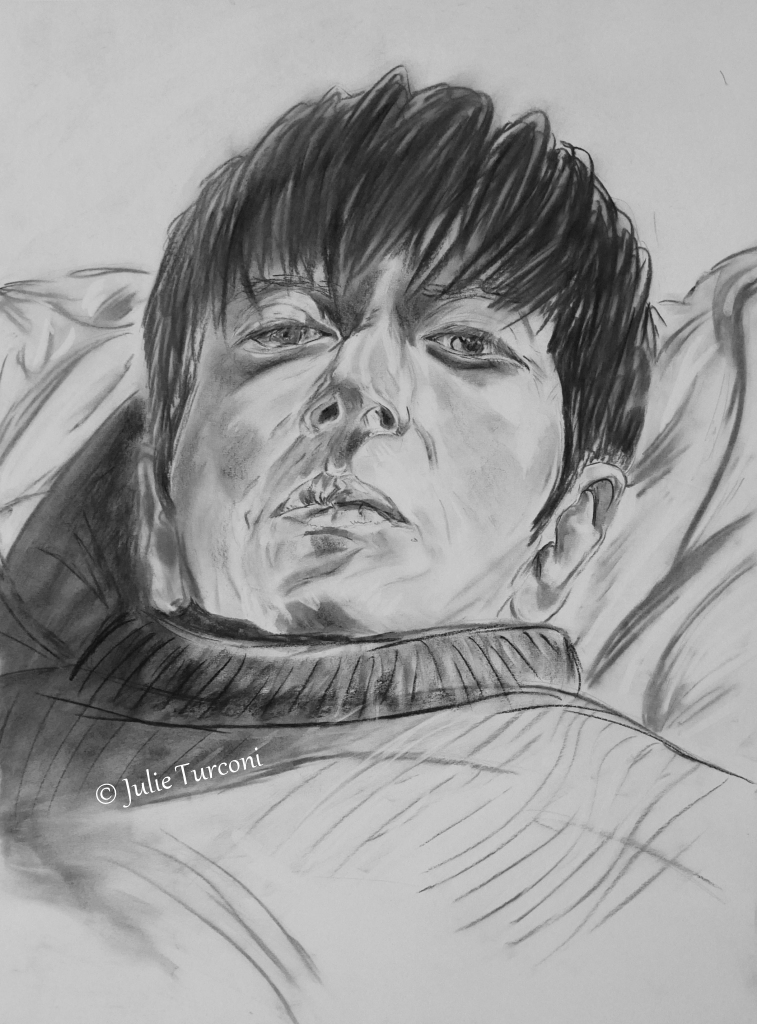 Travailler sur les ombres et lumières au fusain (aux doigts) après une rapide esquisse à main levée au crayon, sur un papier de 18 x 24 pouces et avec un angle que j’ai peu exploré avant = une belle façon d’oublier un peu la chaleur écrasante du dehors! 😉