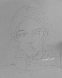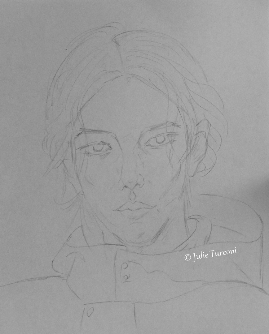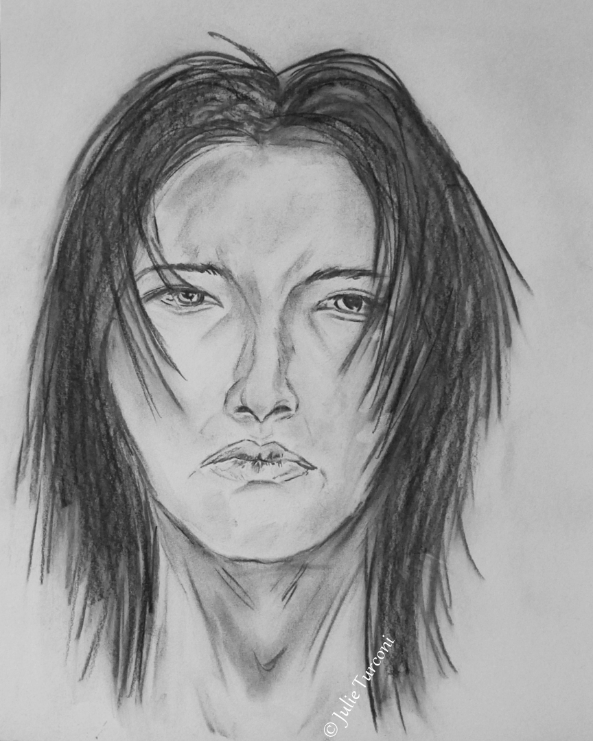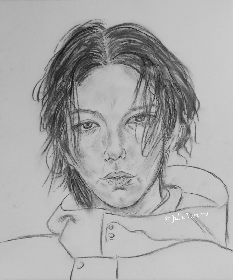 Puisque je parlais de constance, j’ai repris mes bâtons de fusain le lendemain, histoire de continuer à pratiquer. À main levée, sans attentes particulières, pour le plaisir (et la motivation). Avec l’esquisse préalable rapide au crayon pour placer le visage avant de noircir le tout au fusain et aux doigts!