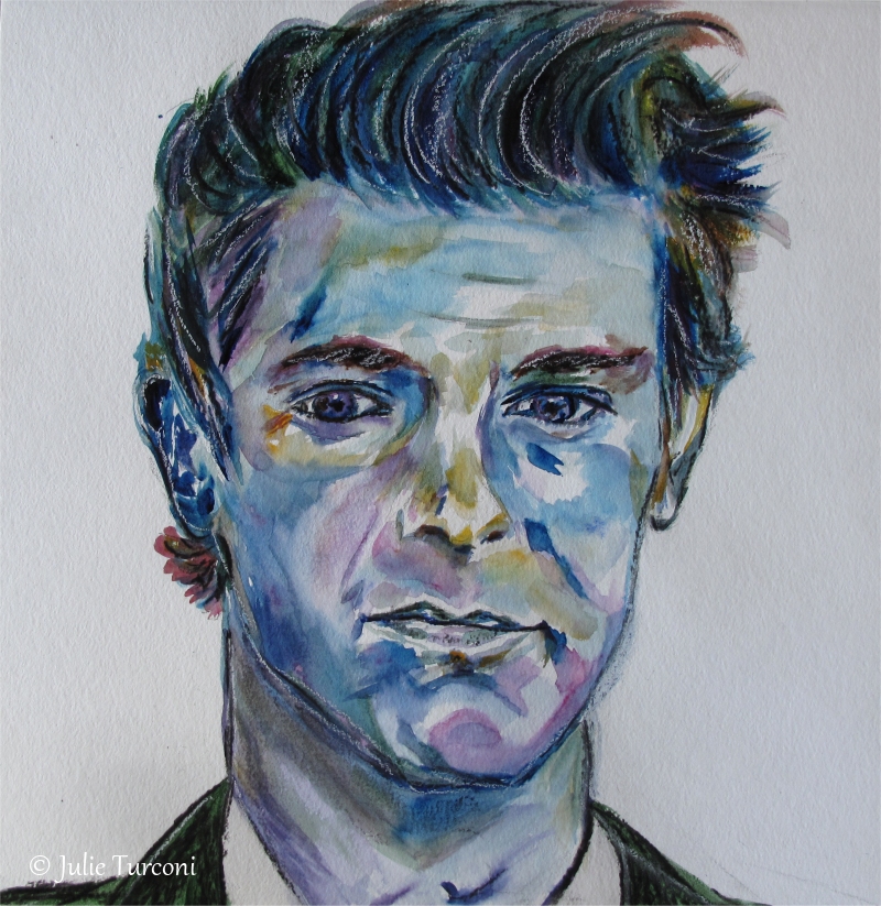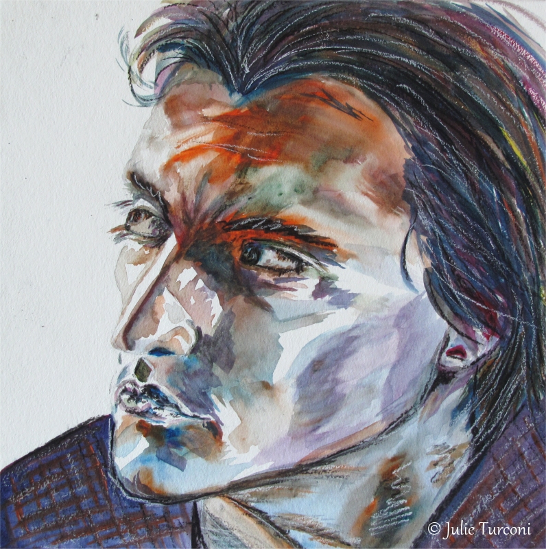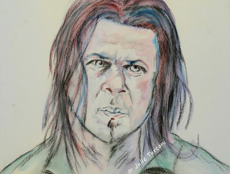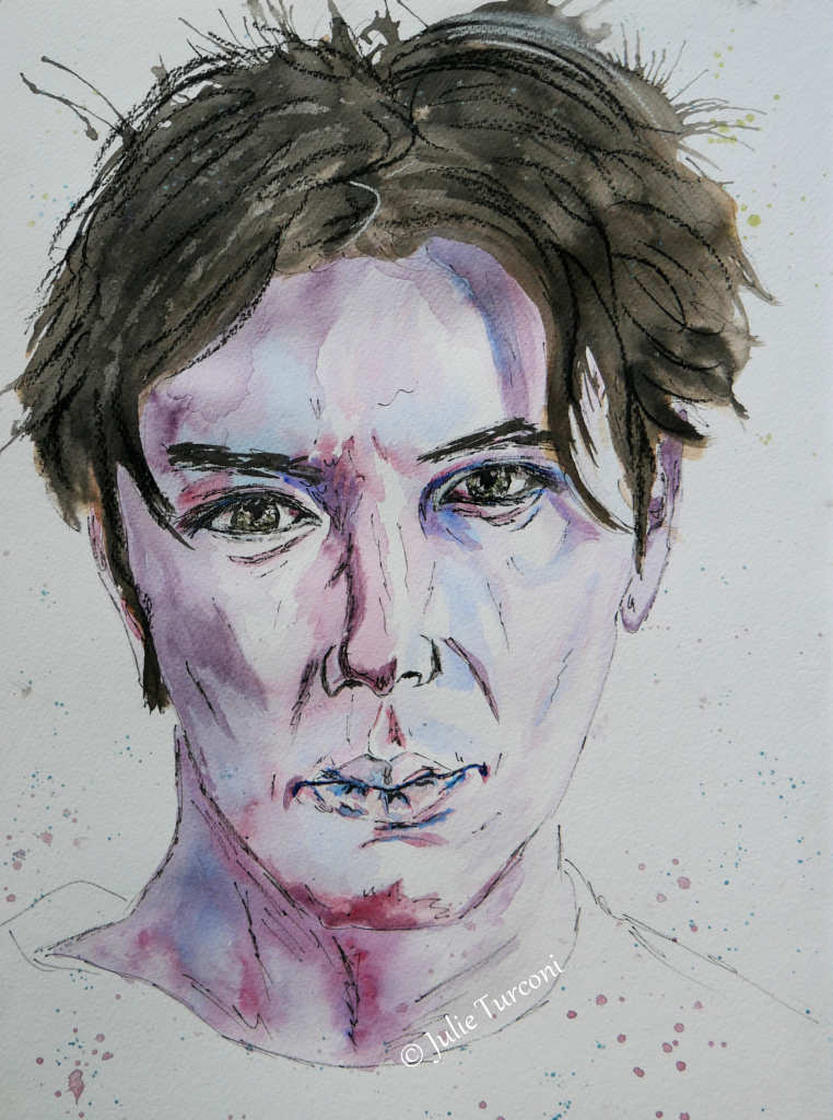 - Bourne’s identity (Matt Damon), aquarelle et fusain, 12 x 16 po, 2017, DISPONIBLE