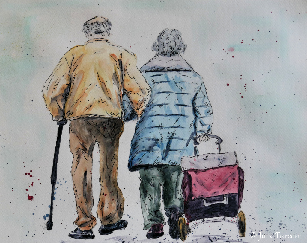 - Sortie en ville – aquarelle et encre sur papier Fabriano – 11 x 14 po
