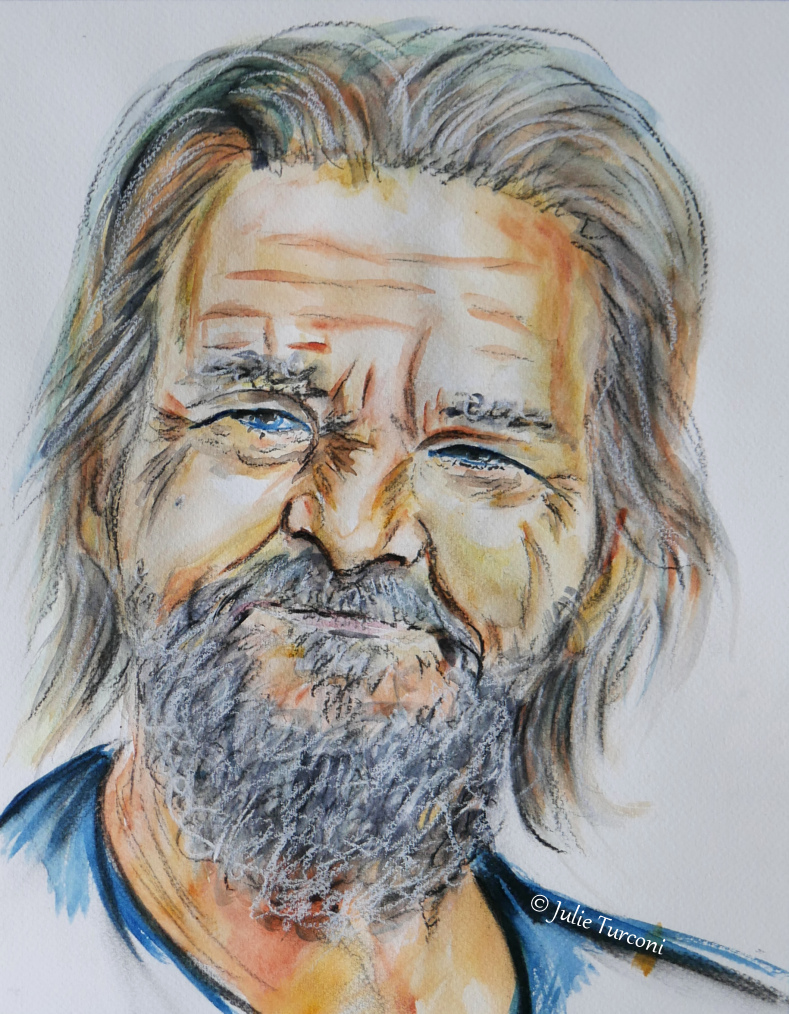 - L’homme du métro – aquarelle et fusain sur toile, 12 x 16 po, 2018, DISPONIBLE