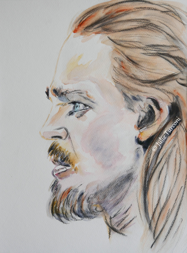 - King of ancient times (Zach McGowan in « The 100 »), aquarelle et fusain, 12 x 16 po, 2017